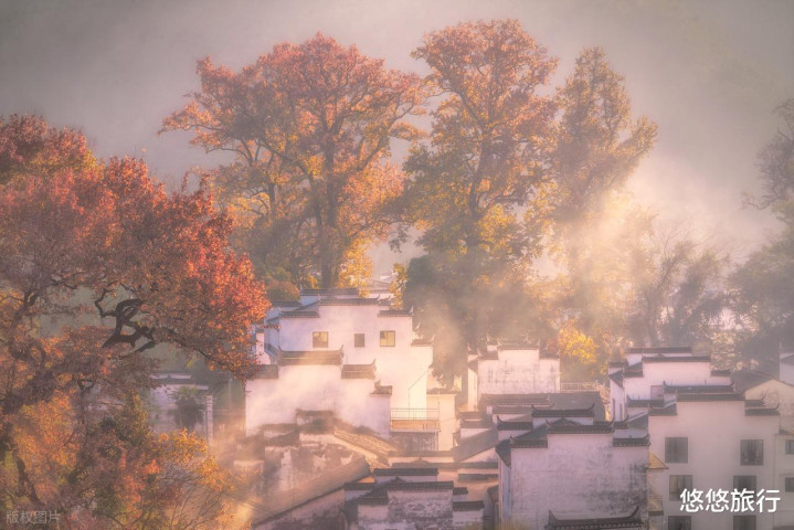 婺源红枫在10月底进入观赏期,最佳在11月中旬-12月初,此时是婺源秋色巅峰时,黛瓦粉墙配上红枫晨雾。隐隐约约的村庄,晨间的光影变换,甚是撩人。