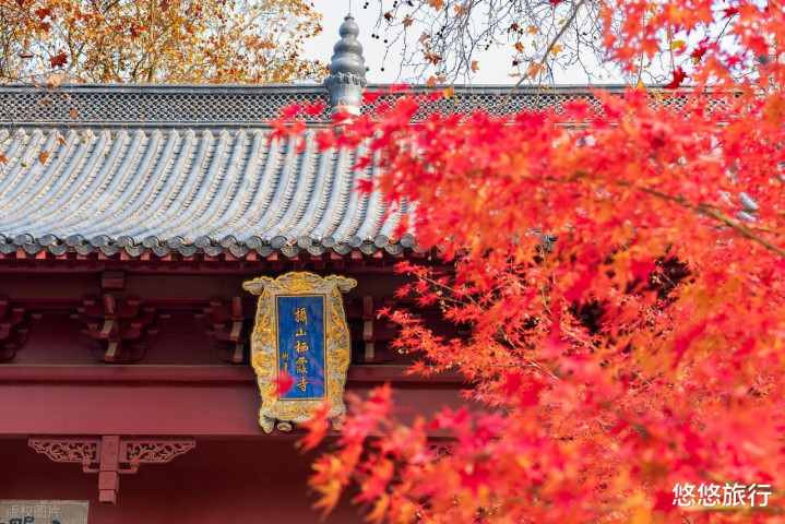 明镜湖深秋湖面轻雾缭绕,钟楼门口的枫叶与古亭搭配。栖霞寺银杏、红叶,古寺、禅音袅袅。