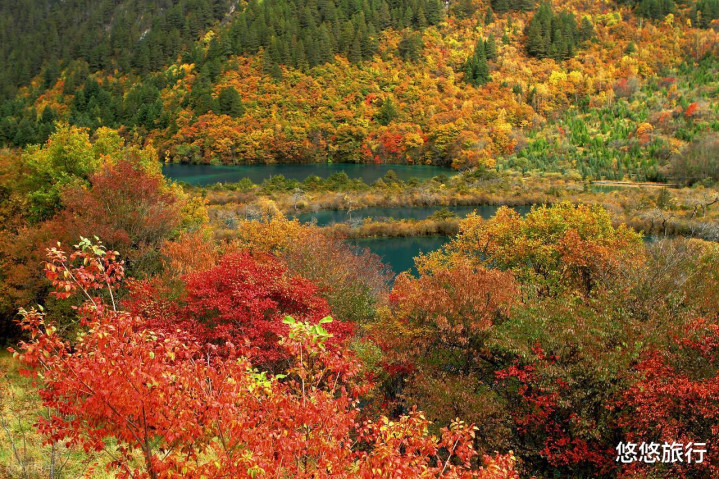 老虎嘴观景台俯瞰五花海,一片火红。镜海南岸水面倒映雪山、彩林。长海东南角冷杉林雪山倒影,诺日朗瀑布可捕捉瀑布、彩虹同框画面。