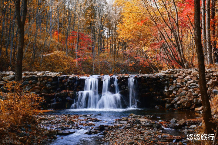 老边沟的溪边枫林,有小桥流水搭配红枫林,石与林、山与泉的交融,可以连着大石湖一起游玩。