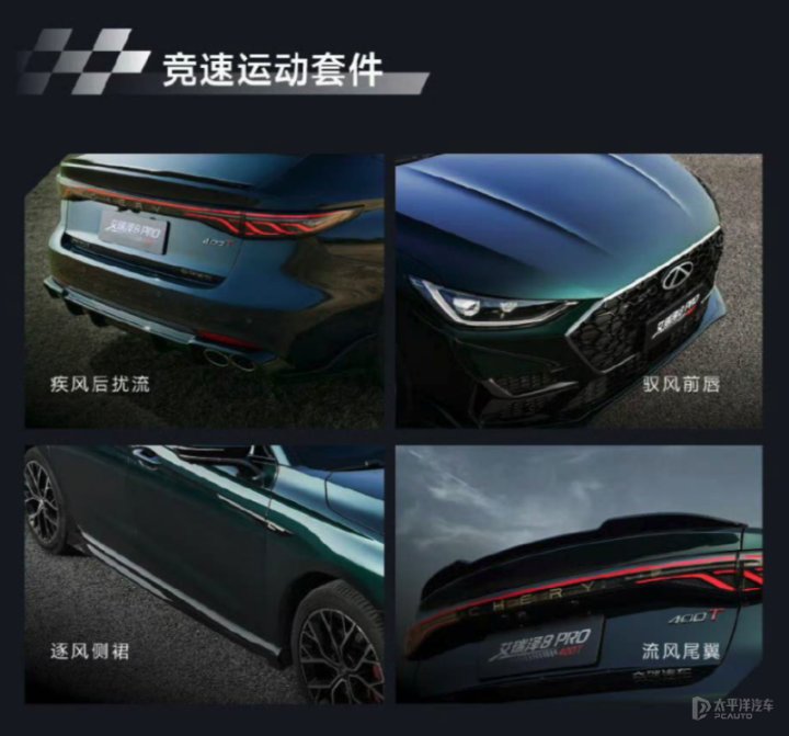 外观方面,奇瑞艾瑞泽8PRO400TGDIDCT豪华型延续现款390TGDI车型设计,整体风格非常运动,并配备竞速运动套件,新车前脸采用六边形星环黑曜格栅,格栅内部为熏黑蜂窝网状结构。车身侧面采用溜背式造型,配备18英寸竞速五旋轮毂和传统机械式门把手,车尾采用贯穿式尾灯布局,并配有双边共四出排气口和后扰流板。